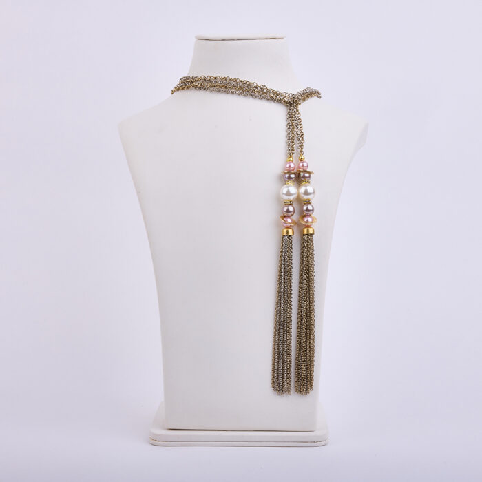 An undeniably beautiful addition to your accessories, strung in two toned chains, our lariats are grounded in glamour
